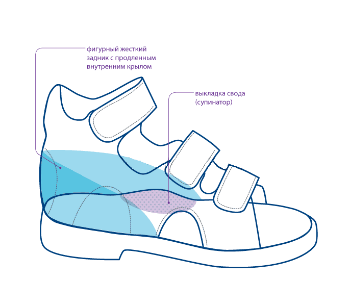 • ортопедический каблук «Томаса» или широкий устойчивый каблук,  продленный с внутренней стороны – исключает вращение (заваливание) стопы вовнутрь и служит для равновесия