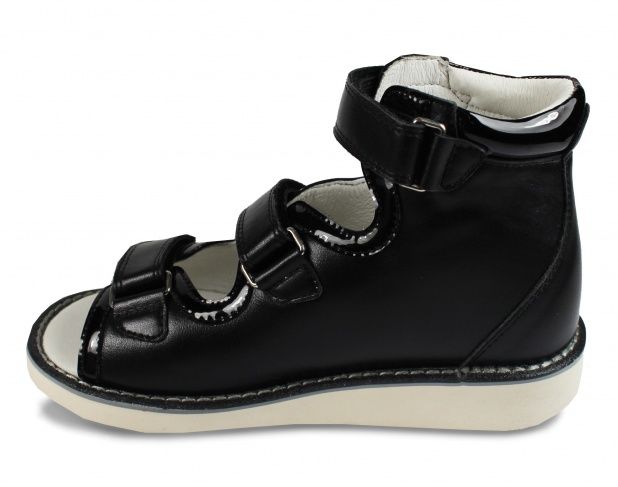 Сандалии изготавливают из нат.кожи. Обеспечивают их жесткой задней частью и берцами, которые отлично поддерживают стопы при их отклонениях. Высокий берец необходим для иммобилизации движения голеностопа. Это дает возможность суставам развиваться правильно или предотвращает развитие деформаций, эффект достигается при регулярном ношении.
