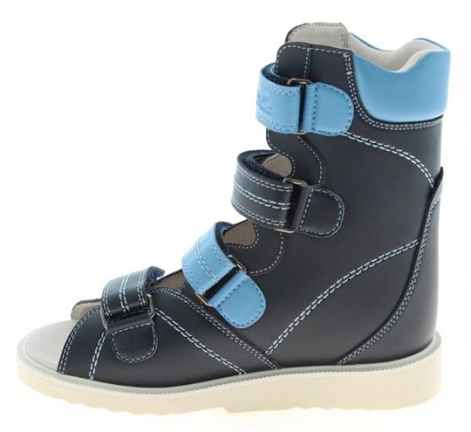Сандалии изготавливают из нат.кожи. Обеспечивают их жесткой задней частью и берцами, которые отлично поддерживают стопы при их отклонениях. Высокий берец необходим для иммобилизации движения голеностопа. Это дает возможность суставам развиваться правильно или предотвращает развитие деформаций, эффект достигается при регулярном ношении.